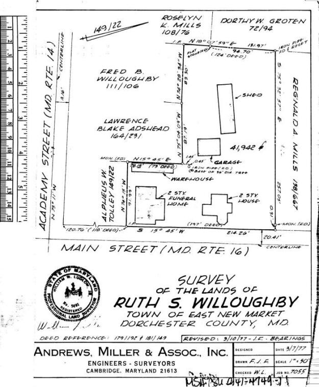 231 MLB 621 - 31 July 1984 - Leonard D. Zeller and Leonard W. Zeller to Leonard D. Zeller & Christine M. Zeller, his wife, for $0: Lots - one lot on the west side of Main Street in the town of East New Market described in accordance with a plat entitled "Survey of the Lands of Ruth S. Willoughby, Town of East New Market", dated March 7, 1977, prepared by Andrews, Miller, & Assoc., Inc. Engineers-Surveyors, in 19 PLC 41. Beginning on the west side of Main Street at the extreme northeast corner of the land herein intended to be conveyed and at the extreme southeast corner of the land of Reginald A. Mills (138 PLC 667), thence leaving Main Street and running with the line of division between the land herein intended to be conveyed and the land of Reginald A. Mills, N75/32W .31f to a monument, thence N75/32W 257.05f to an iron pipe and to the land of Dorothy W. Groten (Liber 72, folio 94), thence S18/07W 37.27f to an iron pipe, thence with the land of Fred B. Willoughby (Liber 111, folio 106), S74/28E 83.3f, thence with the land of Lawrence Blake Adshead (Liber 164, folio 231), S75/04E 87.19f, thence S15/45W 78.15f to a concrete monument, thence S74/15E 91.99f to the west side of Main Street, thence running with the west side of Main Street N15/45E 214.26f to the place of beginning. The land is the identical property which was conveyed unto the said Leonard D. Zeller and Leonard W. Zeller, by deed dated 16 March 1977 in 199 PLC 169.